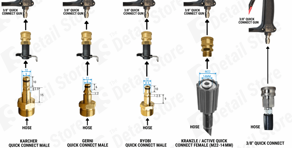 - 1/4-Inch QC: Primarily used for nozzles and spray tips at the end of the wand, such as the CleanSkin 1/4″ Quick Connect Coupler.